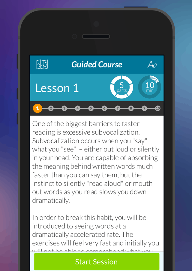 Acceleread is an app that will teach you how to read quicker. Unfortunately, it is outdated and does not seem to work on the latest iOS versions. We recommend to read our overview of the best speed reading apps to learn about suitable alternatives.